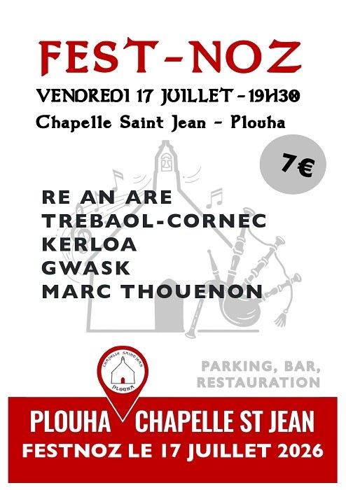 Fest-noz à la chapelle, organisé par les Amis de la Chapelle Saint-Jean. Restauration sur place. Avec Re An Are, Trébaol-Cornec, Kerloa, Gwask et Marc Thouénon. Gratuit moins de 12 ans.