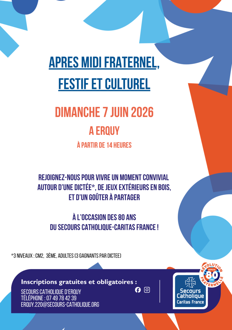 Erquy organise un après-midi fraternel, festif et culturel avec dictées (niveaux CM2, 3ème, adultes), jeux extérieurs en bois, goûter à partager.