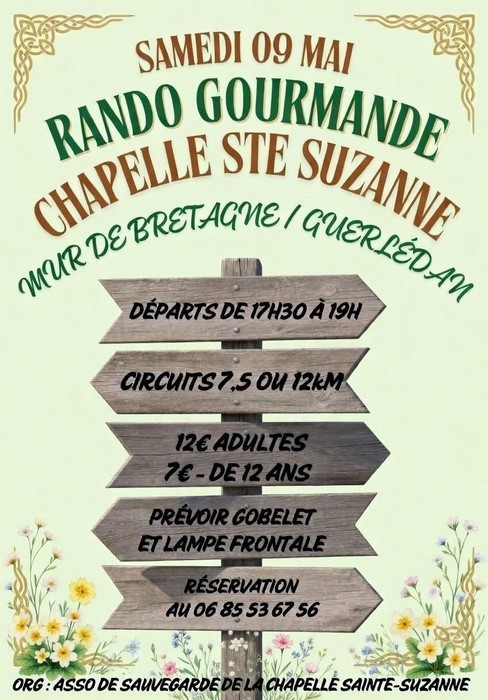 Circuits de 7,5 km et 12 km.Rando en semi nocturne donc prévoir lampe frontale et gobelet. Départ de 17h30 à 19h00 de la chapelle Ste Suzanne. Sur réservation.