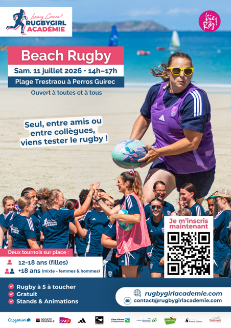 Filles et femmes de 12 à plus de 18 ans pratiquant déjà en club, confirmées ou débutantes en rugby ou beach rugby, venez avec Lénaïg Corson et sa Rugby Girl Académie vous affronter sur la plage de Trestraou, c’est gratuit !